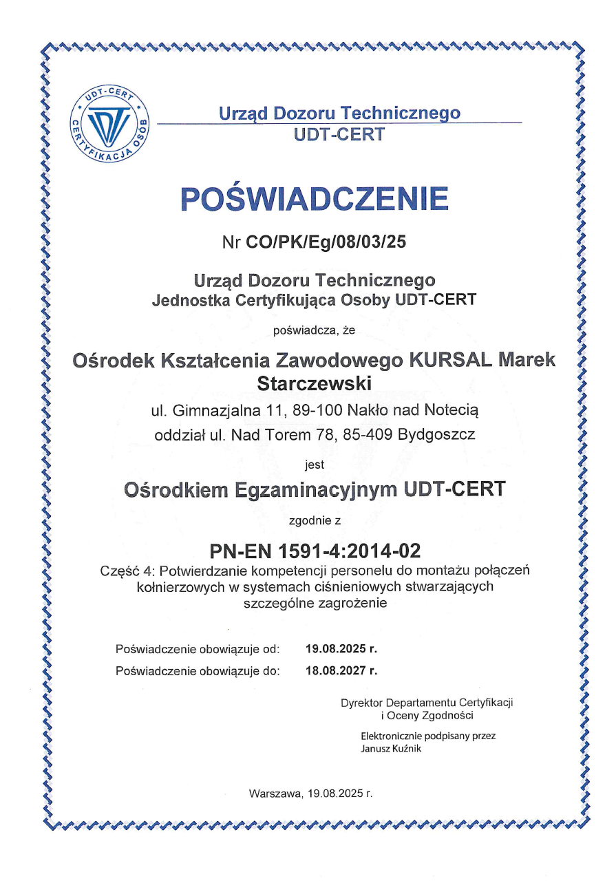 Jesteśmy jednostką akredytowaną przez Urząd Dozoru Technicznego, co stanowi gwarancję najwyższych standardów szkolenia. Każdy uczestnik po zakończeniu kursu ma możliwość przystąpienia do egzaminu zewnętrznego przed Komisją Urzędu Dozoru Technicznego.
