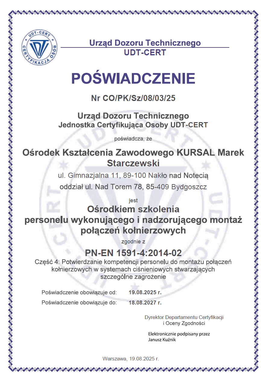 Jeśli chcesz zdobyć specjalistyczne uprawnienia do montażu i nadzoru nad połączeniami kołnierzowymi śrubowymi, szkolenie zgodne z normą PN-EN 1591-4 w Ośrodku Kształcenia Zawodowego Kursal to doskonała inwestycja w Twoją przyszłość zawodową. Specjaliści posiadający kwalifikacje do obsługi połączeń śrubowych w systemach ciśnieniowych są niezbędni w przemyśle energetycznym, chemicznym, petrochemicznym oraz w infrastrukturze krytycznej.